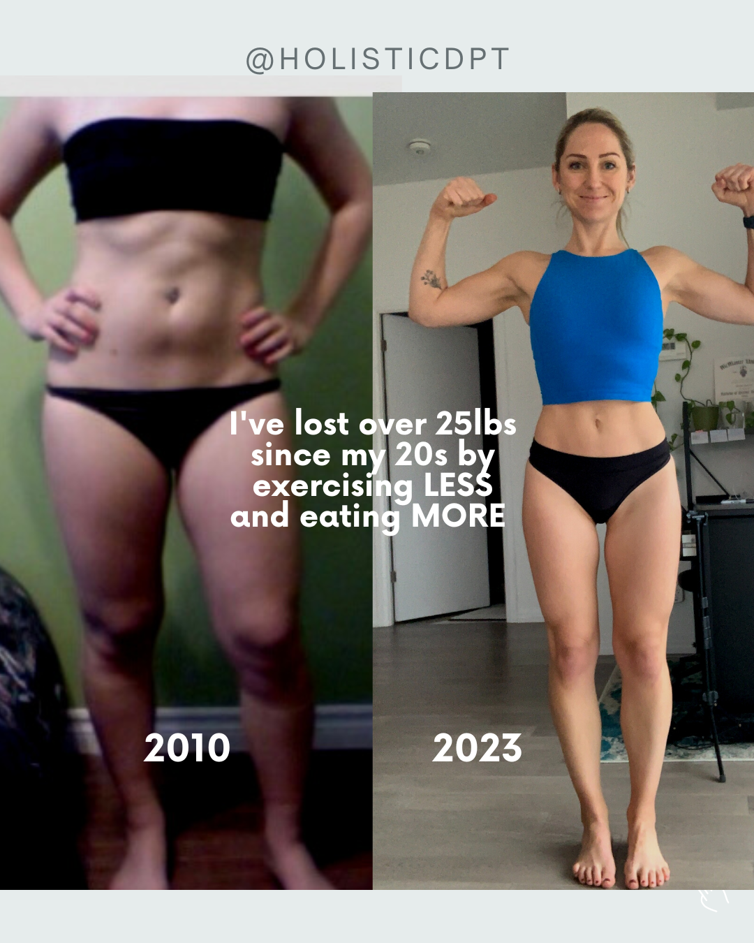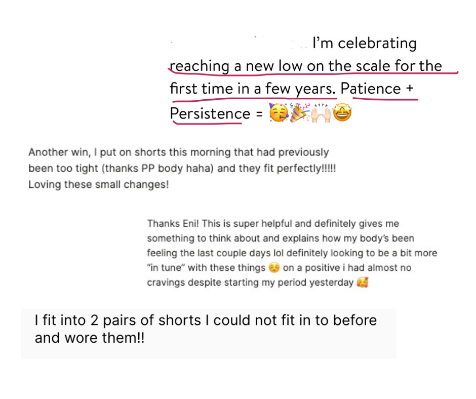 And if you keep trying to “push through” with restrictive diets and intense workouts, you’ll only keep yourself stuck and continue the frustrating cycle for longer.